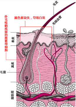 白癜风的发病主要取决于人体的黑色素细胞受损、病变、变异而导致黑色素细胞合成障碍,从而在皮肤表层形成白斑的一种疾病。临床实践证明:白癜风治疗必须要立足于黑色素细胞角度入手,真正从根源上治疗。