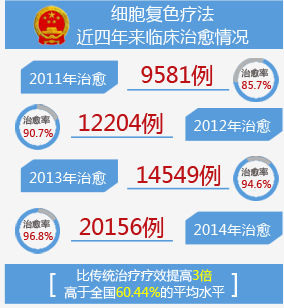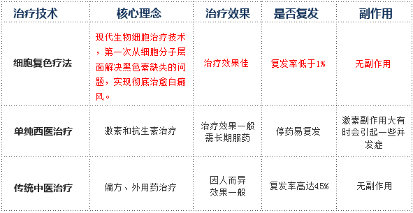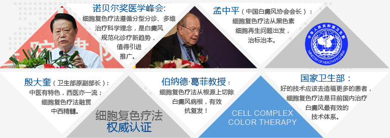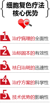 "细胞复色疗法"是我国首个将生物细胞学工程运用于白癜风临床治疗,严格遵循了细胞超微结构与白癜风病理发展规律;以"黑色素细胞修复——合成——再生——复色"为新医学理论突破口,从生物细胞学、分子免疫学入手,系统分析了白癜风的病因、病理及治疗方法,利用现代高科技设备,从细胞治疗层面解决黑色素缺失的一种白癜风新型治疗技术。