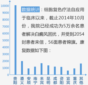 经专家鉴定和临床验证,"细胞复色疗法"具有疗程短、见效快、治愈率高、杜绝病根、疗法安全、易于接受、无不良反应等特点,截至目前已使全国数十万例白癜风患者得到了康复,临床治疗有效率达到98%以上,在国内外引起强烈反响。贵州白癜风医院作为"细胞复色疗法西南地区唯一指定推广医院",吸引了全国30多个省市、自治区(包括港、澳、台)及美、加、澳、南非、印度等世界上50多个国家和地区的白癜风患者前来就诊。