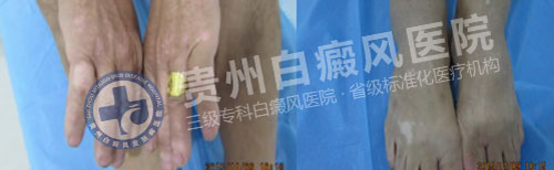 眼前的这位精神矍铄的大爷在6年前一次旅游回家后发现自己的双手足背开始不明原因出现了大小不一的块状白斑,起初认为是晒后的皮肤灼伤,从药店购买的外擦药物自行涂抹。然而没过多久,毕节大爷的双手足背的白斑越发严重,原本分散型的块状白斑居然大片扩散开来!