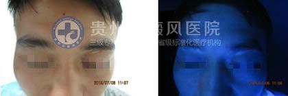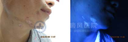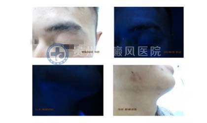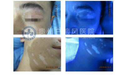 Wood灯:左眼角、右下颌、见点状、片状白斑,wood 灯下显示亮蓝白色斑片,边界不清晰,伴毛发变白,色素脱失程度90%。(详见图)