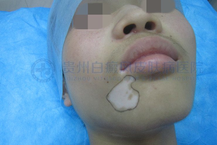 ▲病 史:患者1年前发现面部白斑,曾在别家医院采用过外用药治疗(药名不详),病情无好转,且白斑逐渐扩散,今日来我院治疗。