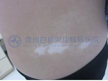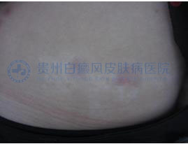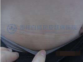 1、wood灯:患者腹部白斑色素脱失大约60%