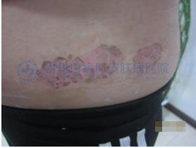 ▲病史:患者腹部白斑3年,进行性加重,曾在皮研所治疗,口服药:(药物不详);外用药:(药物不详)、效果不佳,今来我院就诊。