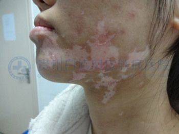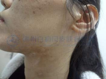 ▲病史:患者于半年前面部、颈部出现白斑,未及时采取治疗,后白斑扩散,今来我院就诊治疗。
