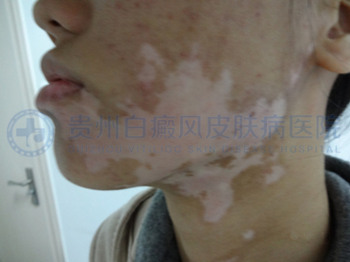 初诊时,患者面部和颈部有大面积白斑,白斑边缘模糊,处于进展期。