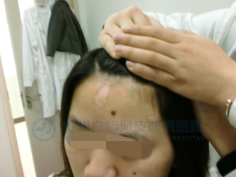 ▲病史:患者于半年前发现额头白斑未去医院及时治疗,今来我院就诊。