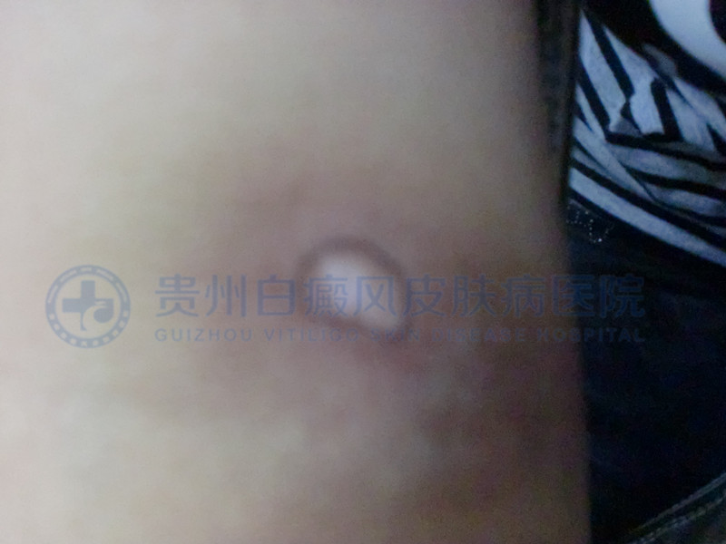 1、伍德灯:患者手臂色素脱失严重,边缘模糊不清。