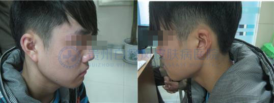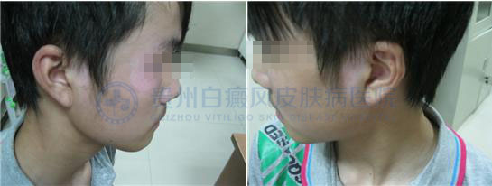 (初诊时,患者两侧耳廓及双眼眼周白斑明显,色素脱失严重,边缘模糊,白斑处于进展期)