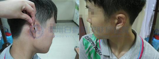 (针对患者病情,医生采用308nm准分子光+中药熏蒸进行治疗,一个疗程时间后,白斑处大量产生黑色素,基底颜色加深,疗效显著)