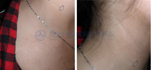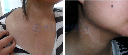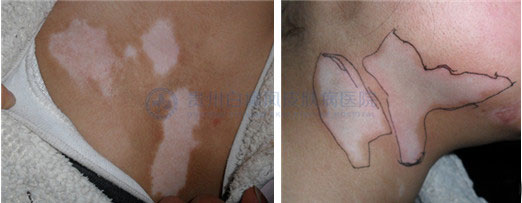▲病 史:患者2年前发现胸部白斑,曾在别家医院采用过口服药及外用药治疗(药名不详),病情无好转,且白斑逐渐扩散至颈部,今日来我院治疗。