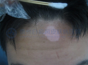 (初诊时,患者额头处白斑明显,边缘清晰,处于进展期)
