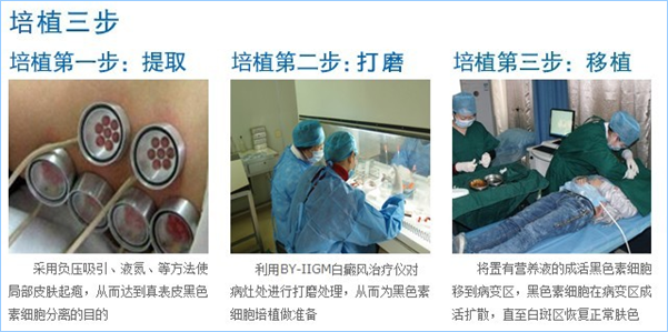 通过仪器操作,从自身正常皮肤提取分离正常健康黑色素细胞,提取好后再经过培植分离,处置白斑部位然后再把提取培植分离好的黑色素细胞介入的白斑的部位同时配合细胞营养液,黑色素生长因子促使细胞吸收,包扎七天后拆敷料就能看见明显效果。