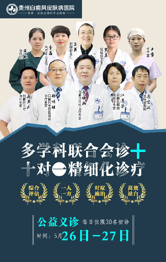 据了解,贵州白癜风皮肤病医院为解决广大患者久治不愈、病情反复等诸多问题不断出谋划策,随着2018数博会假期的到来,医院决定于5月26日—27日开展贵州省白癜风多学科联合会诊。白癜风外科治疗专家李顺柏、中西医结合治疗专家郑明理、细胞免疫学专家江清华、光疗治疗专家马其正联合坐镇,住院部医师岳宏远、光疗中心李鑫主任、护理部吕英主任、治疗区黄敏、手术室王雪、检验科罗美医生强势加盟,从检查到问诊、治疗到护理,全方位监督、交流、评估、保障,为您打造一场白癜风行业的“诊疗博览会”。